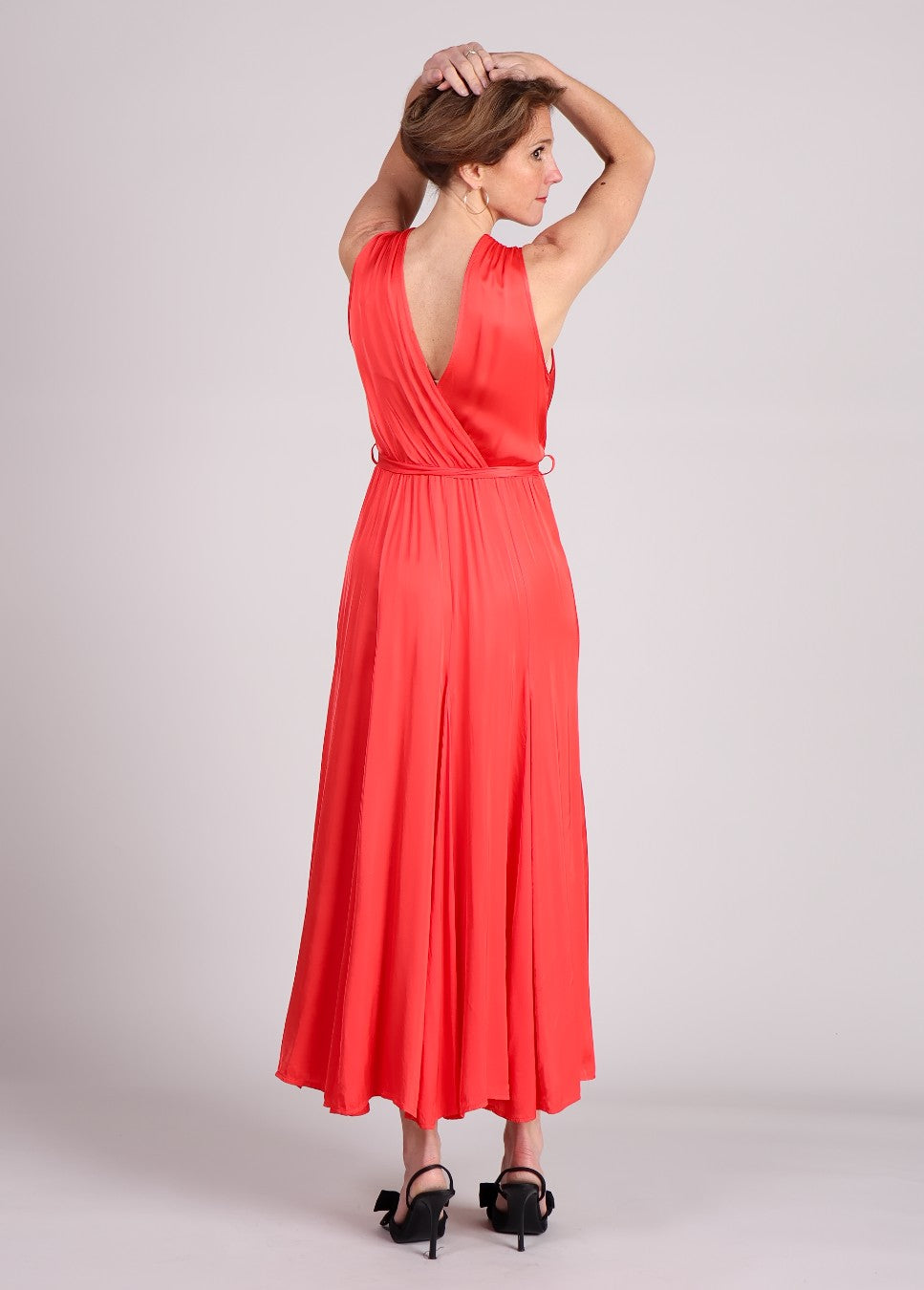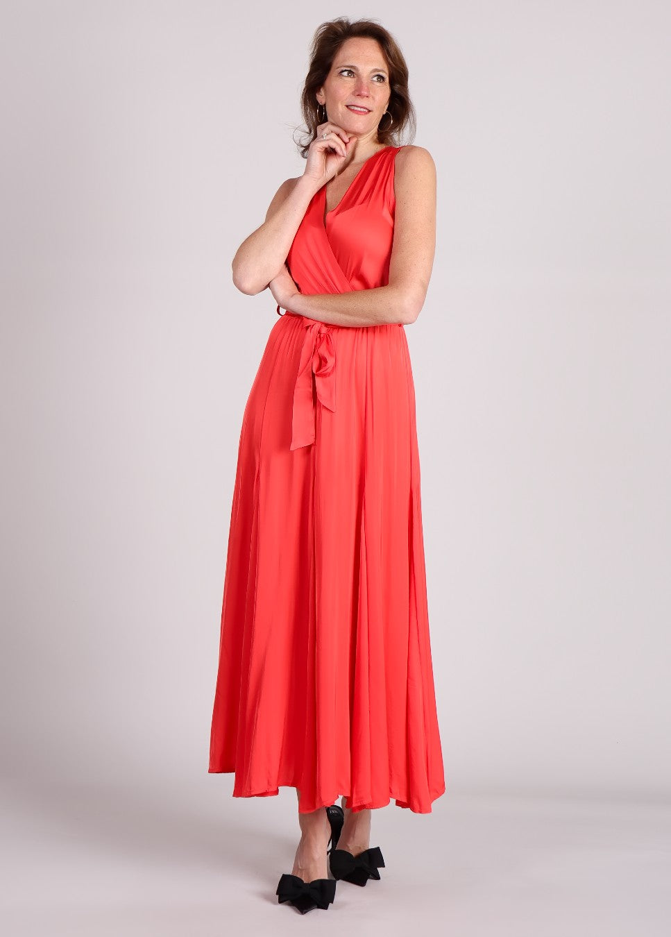 De FRNCH Iride Maxi-Jurk in rood straalt pure elegantie uit. Gemaakt van een luxueuze satijnen stof, biedt deze rode jurk een vloeiende en verfijnde look die perfect is voor speciale gelegenheden. De V-hals en mouwloze pasvorm creëren een vrouwelijk silhouet, terwijl de verstelbare strik in de taille zorgt voor een flatterende pasvorm.