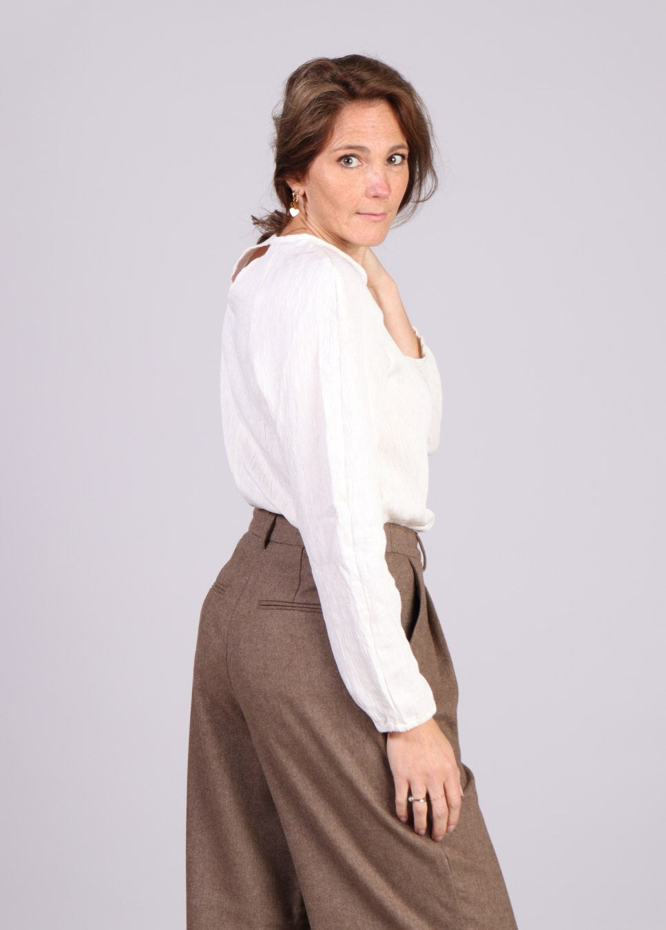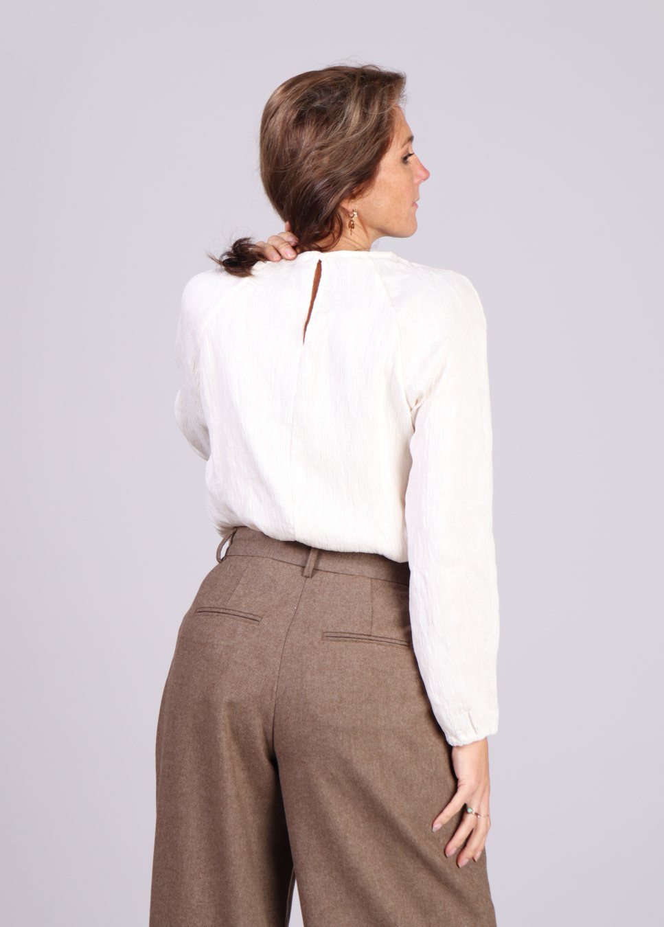 De gestructureerde kwaliteit van de stof geeft de Miesha blouse een luxe uitstraling, terwijl de subtiele ronde halslijn en delicate knoopsluiting aan de achterkant zorgen voor een elegante finishing touch. De witte blouse heeft een normale pasvorm.